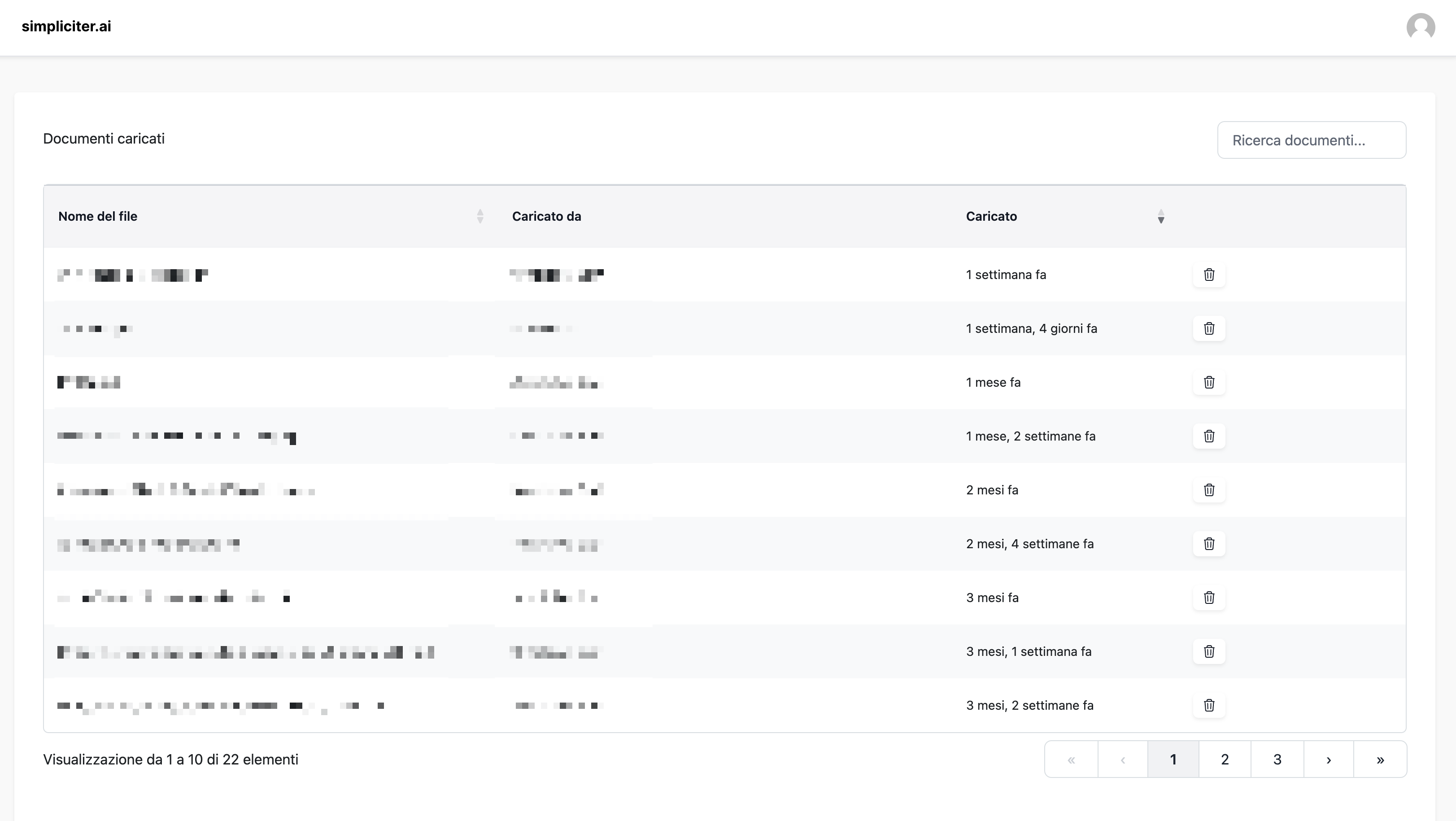 Per trovare rapidamente un documento specifico, puoi utilizzare la barra di ricerca posizionata in alto a destra. La ricerca filtra i risultati in base al nome del file, e la visualizzazione paginata ti permette di navigare facilmente tra i tuoi documenti, mostrandone 10 per pagina.
