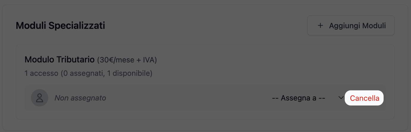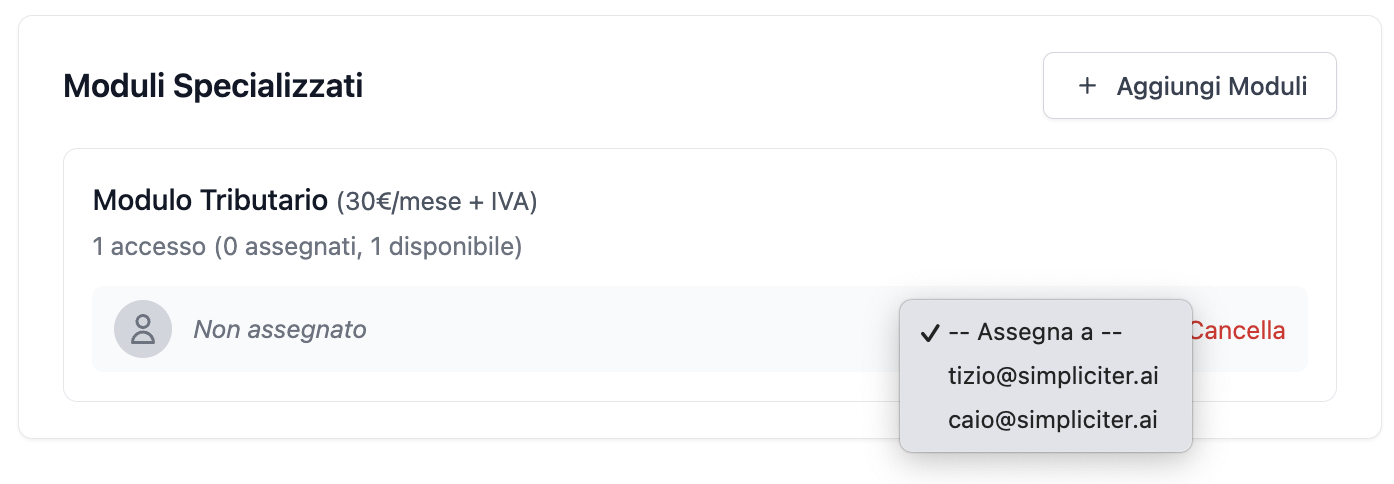 In caso di abbonamento Business o Personalizzato, l'amministratore dell'account potrà assegnare ad uno dei membri del proprio team l'accesso al modulo tramite selettore nella sezione "Moduli Specializzati".
