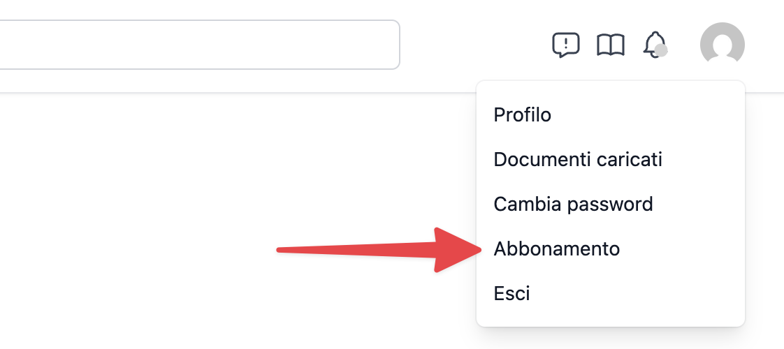 Per aggiungere un modulo all'abbonamento corrente, visita la pagina di gestione Abbonamento. La troverai cliccando in alto a destra sull'icona tonda (oppure, se da telefono, sui tre trattini orizzontali) e seleziona "Abbonamento".