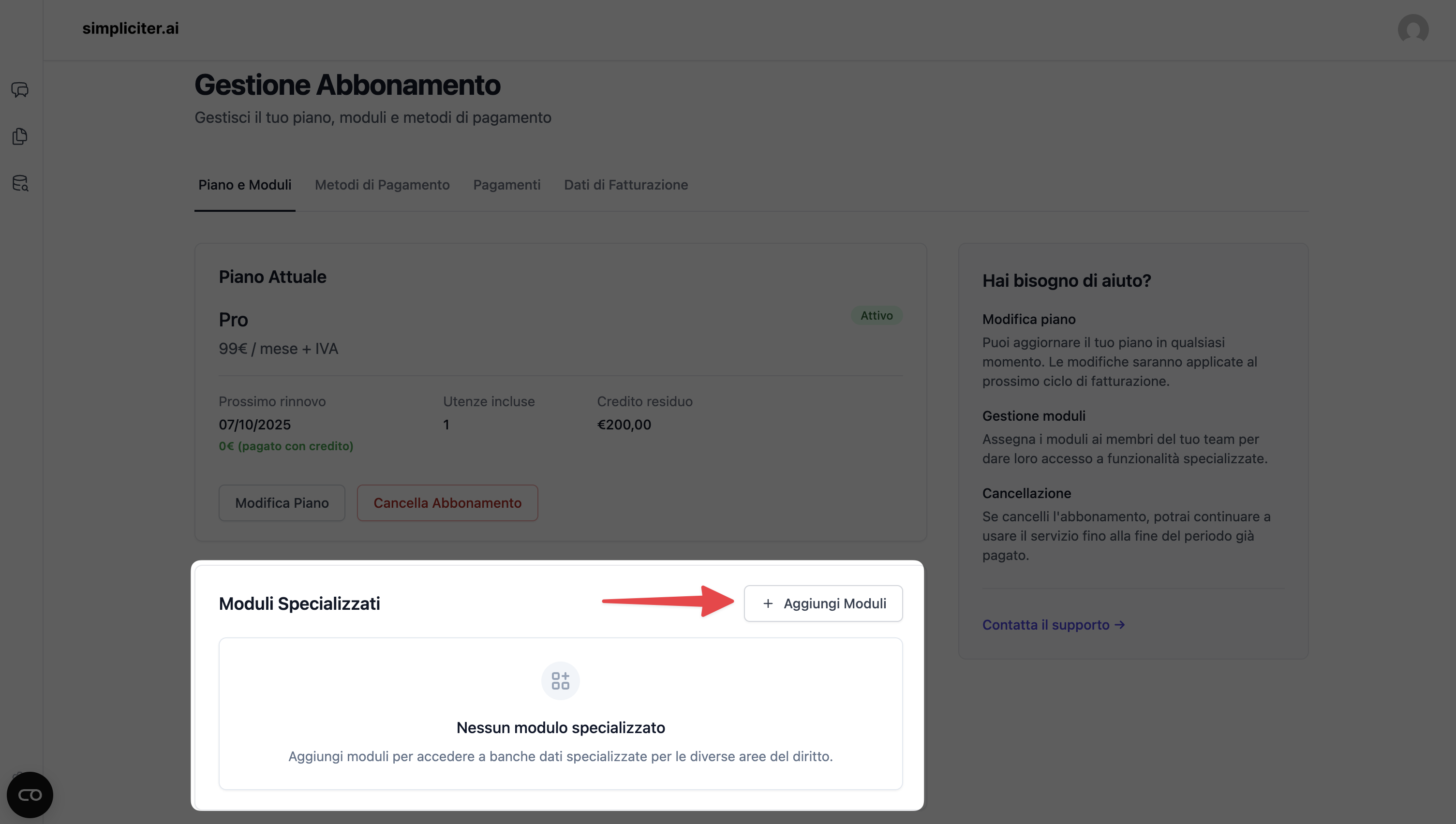 Nella pagina che si aprirà, selezionare "Aggiungi Moduli" nella sezione "Moduli Specializzati". Dopodichè basterà completare la procedura di acquisto ed il modulo sarà immediatamente disponibile per l'utlizzo.
