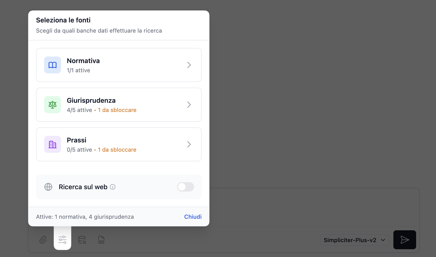 nella sezione di input della chat e selezionare Giurisprudenza o Prassi in base alla banca dati che si vuole selezionare. La selezione rimane associata alla conversazione e può essere modificata in qualsiasi momento.