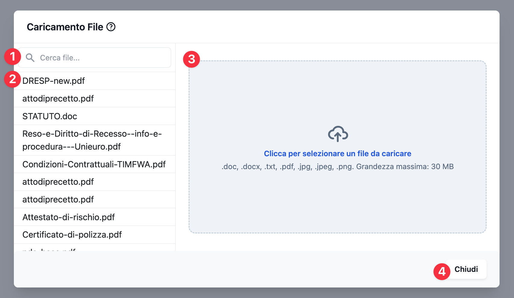 - Lista dei file già caricati: puoi caricare nella conversazione un file precedentemente caricato