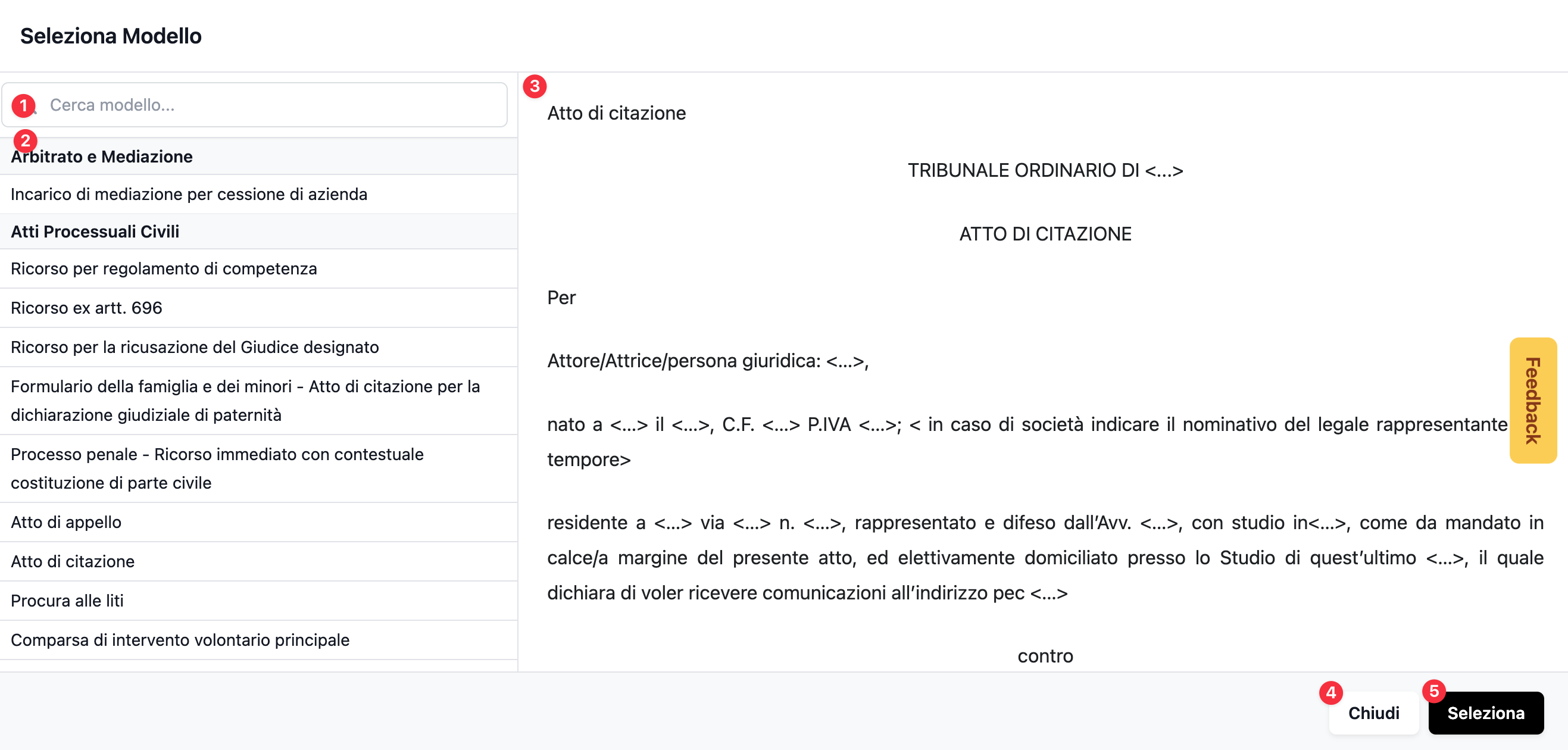 1 - Ricerca nome modello 2 - Lista di modelli disponibili 3 - Anteprima del modello 4 - Chiudi finestra 5 - Seleziona modello